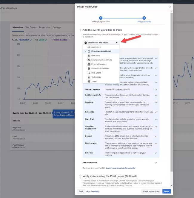 如下图所示,Facebook还根据行业类型对标准事件代码进行了分组,从而提供你可能想要使用哪些代码的建议,但你的使用并不会仅限于这些分组。你可以使用任何你想要的标准事件代码。
