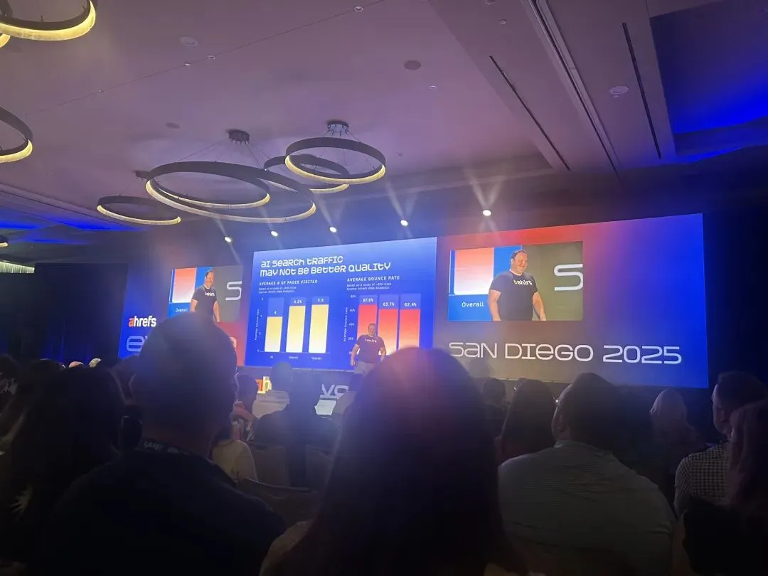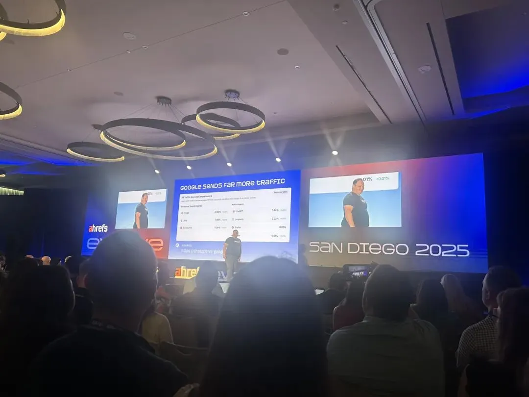 上个月我去美国参加了Ahrefs的SEO大会,在整个大会中其实并没有过多去讲关于GEO的内容,更多的是讲了Branding的建设,为数不多的GEO相关内容,也主要用数据分析了现在的流量状况