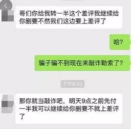 咱们都知道有的竞争对手会找刷手或者刷单机构给竞争对手刷差评,现在这波刷手(刷单机构)反过来找被刷了差评的卖家,可以花钱帮他删掉这个差评,甚至不给钱还扬言要继续上差评。 如图↓↓↓,卖家被微信的聊天记录 (点击可以放大)