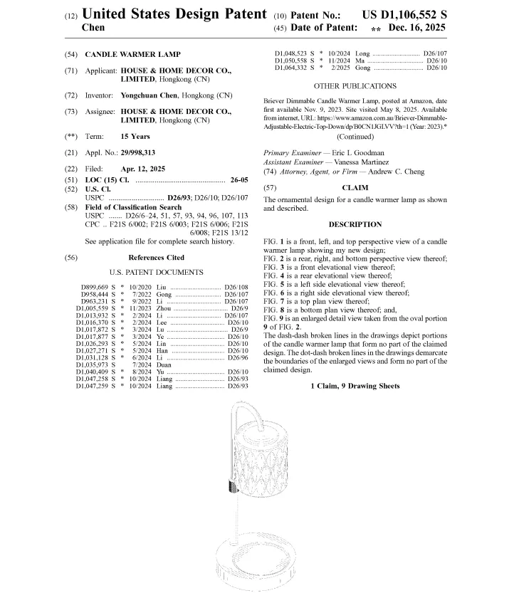 12月16日美国专利局公布一批最新下证美国外观专利,其中包含不少热销产品,比如在亚马逊上月销10K+的爆款融蜡灯,专利名称Candle warmer lamp,专利号USD1106552S,2025年4月12日申请: