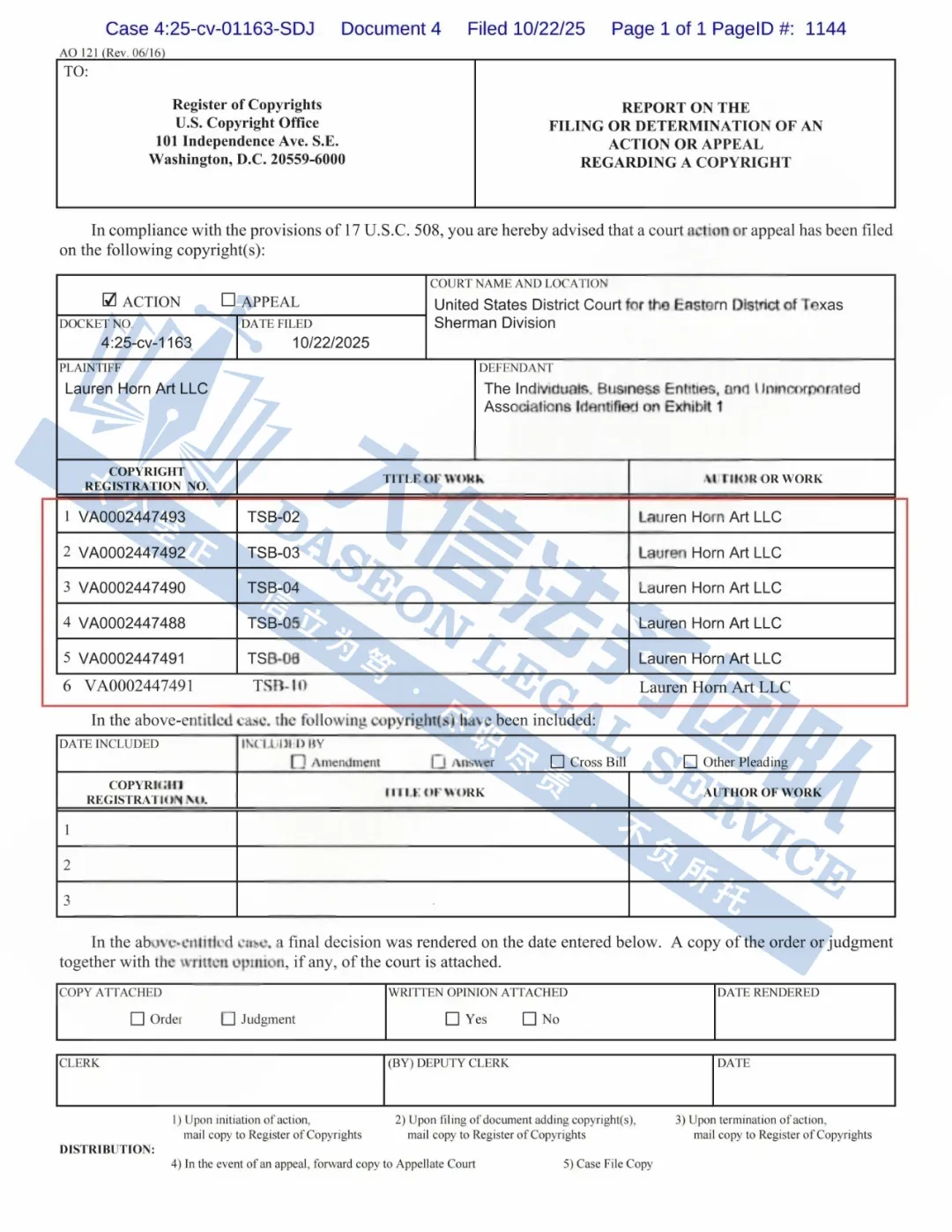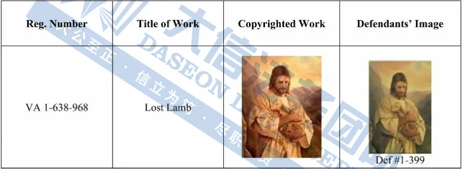 此案为版权维权,目前已有399家店铺被告,涉及一张名为《Lost Lamb》的版权作品,版权号VA 1-638-968,值得注意的是,原告注册了12张版权作品,以下是涉及版权的具体信息,除此之外,官网上的其他作品未经授权不得擅自使用,侵权风险极高,跨境卖家尽快检索下架,避免TRO侵权风险!