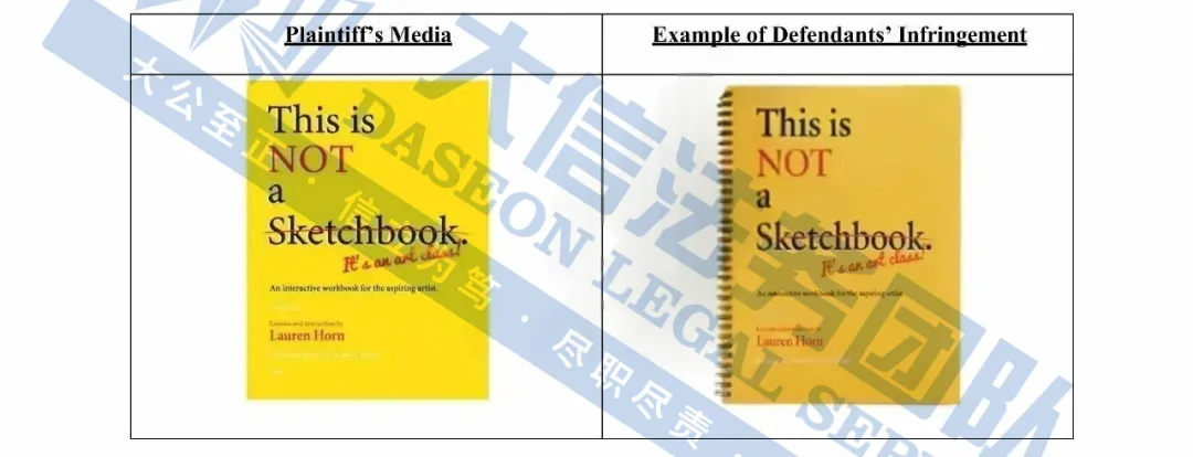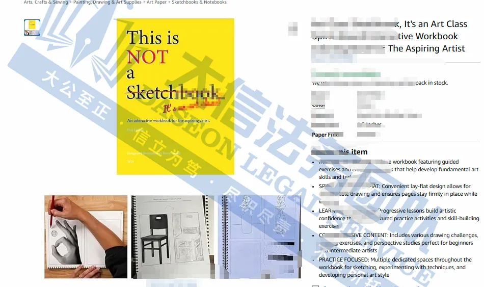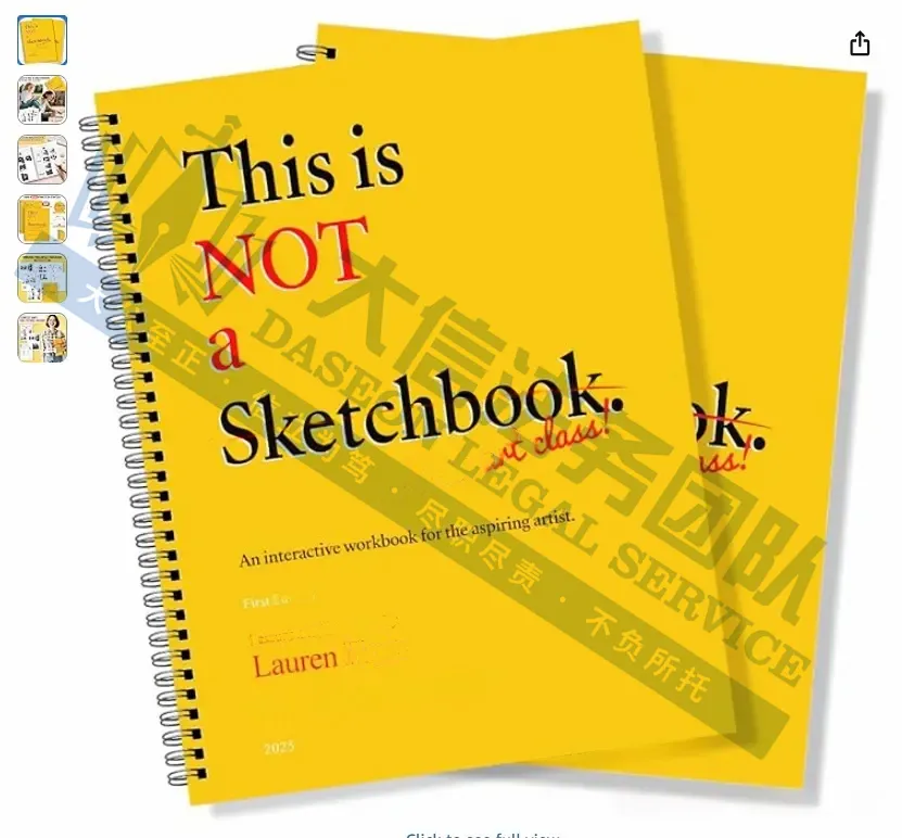 此案为版权维权,目前已有269家被告,涉及6张版权作品,涵盖This is Not a Sketchbook绘画教程的产品展示图,目前具体版权图片还未公开,以下图片卖家可参考,除此之外,官网上的其他作品未经授权不得擅自使用,侵权风险极高,跨境卖家尽快检索下架,避免TRO侵权风险!