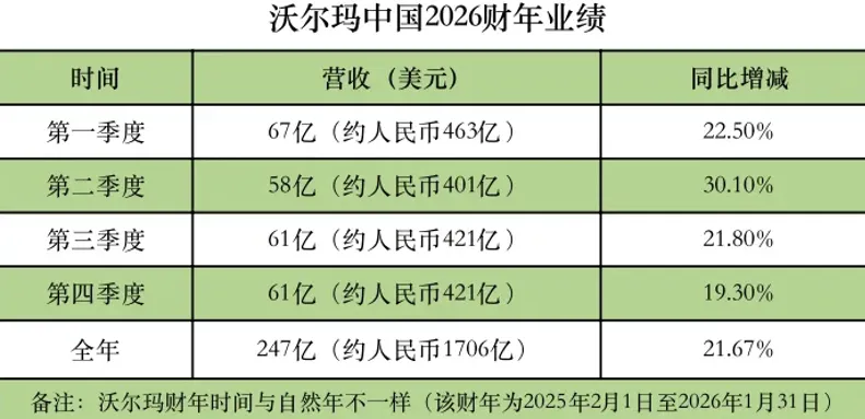 2026财年第四季度,中国市场实现净销售额61亿美元,同比增长19.3%;从全年来看,2026财年沃尔玛中国净销售额约247亿美元,同比增长约21.67%。