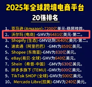 在2025年全球跨境电商平台20强排名中,沃尔玛以6481亿美元GMV位居第二,实力不容小觑。