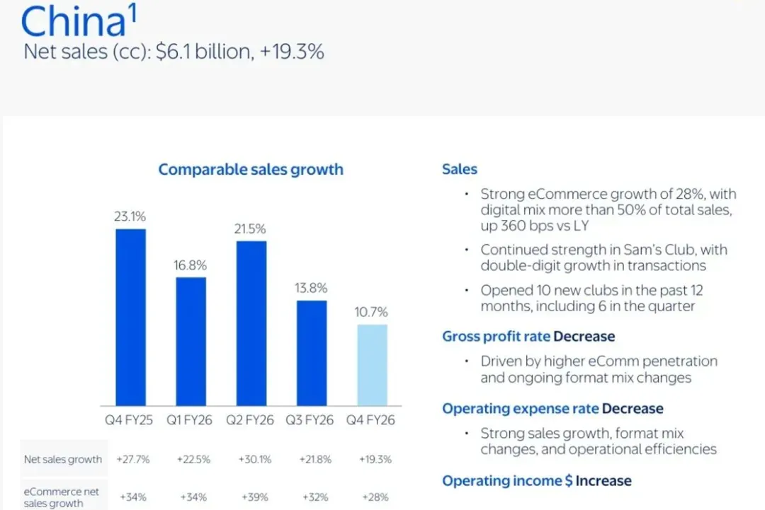 值得注意的是,2026年春节旺季较往年延后,通常会给当季零售数据带来压力,但沃尔玛中国本季度的可比销售额仍录得10.7%的稳健增长。