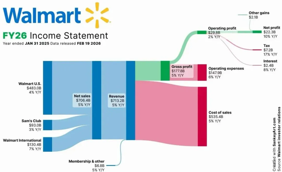 据报告,沃尔玛全年实现总营收7132亿美元,同比增长4.7%;调整后营业利润311亿美元,同比增长5.4%,整体呈现稳步上升态势;