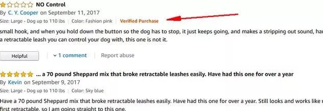 如上图所示,箭头所指即为带VP真实购物的review,而下面那条则是不带vp的。