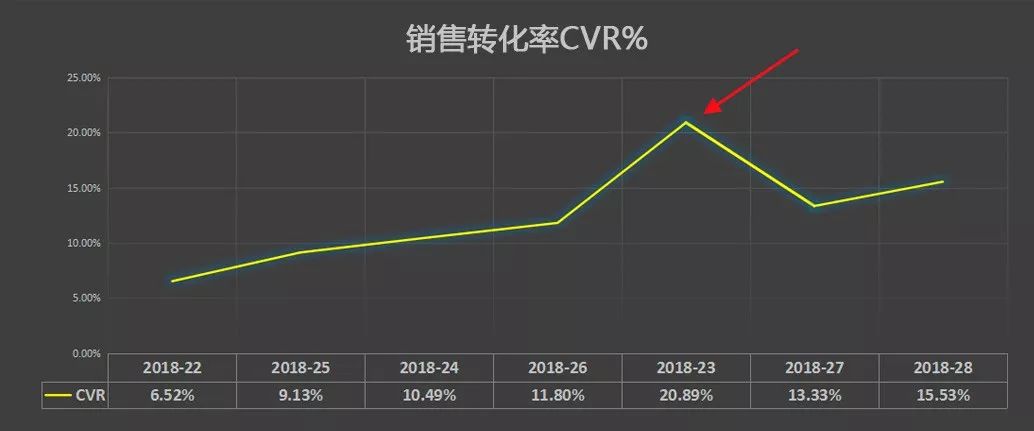 通过报告解读,用图表展示得到下图,清晰可见为何转化率会有个小高峰?我们能否在此复制当时的销售动作来保持高转化率?为什么后期转化率又降低了?
