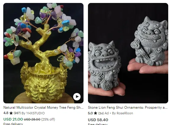 家里或者办公室内摆放一些风水类的摆件,有聚财的作用,这在玄学圈里盛行。其中包括景观盆栽、风水植物、金元宝摆件等,这些商品不仅有招财的功能,还具备治愈功能,得到了老外的高度喜爱。