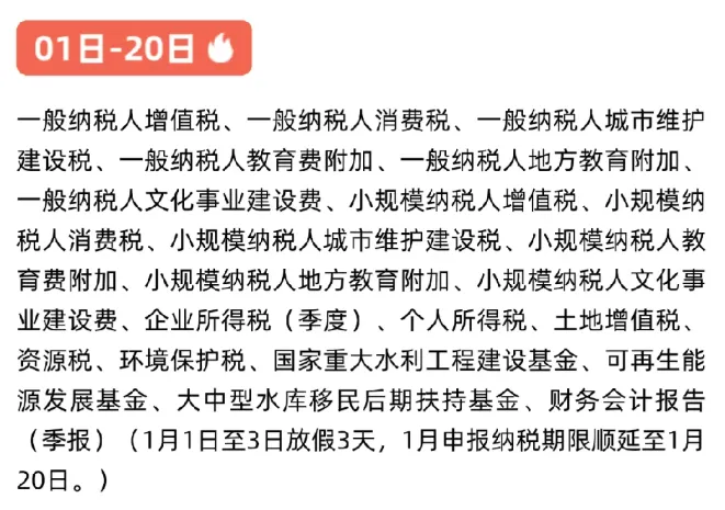 2025年四季度的增值税、企业所得税的法定申报将于1月20日截止。