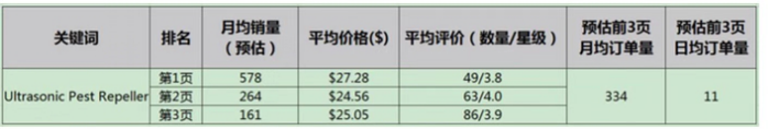 通过软件Jungle Scout抓取关键词“Ultrasonic Pest Repeller“关键词前三页的预估平均月销售额,依次为578,264,161。第一页ASIN中,最高月销量2400件,最低月销量5件,平均日销量16件。第二、三页的销销量分别是264、161件,单量相对第一页来说偏低。