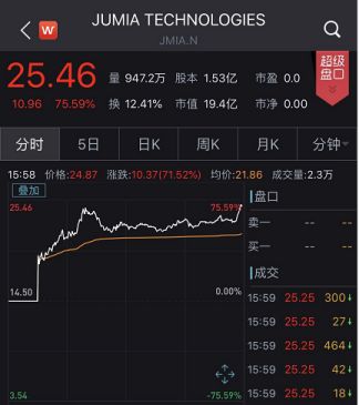 4月12日,被称为“非洲阿里巴巴”的非洲最大电子商务运营商Jumia Technologies在纽交所正式挂牌。上市首日Jumia股价大涨75.59%,报25.46美元,总市值为19.44亿美元,(约合人民币130亿元)。