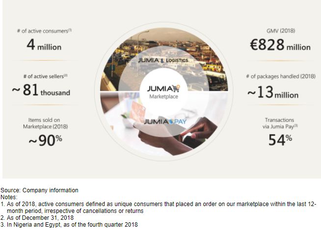 2018年,由于非洲智能手机使用量激增,Jumia客户数量猛增48%,达到400万人左右。活跃卖家数为8.1万,网站成交金额达到8.28亿欧元(约合人民币63亿元);营收由2017年的9400万欧元增长至2018年的1.306亿欧元。