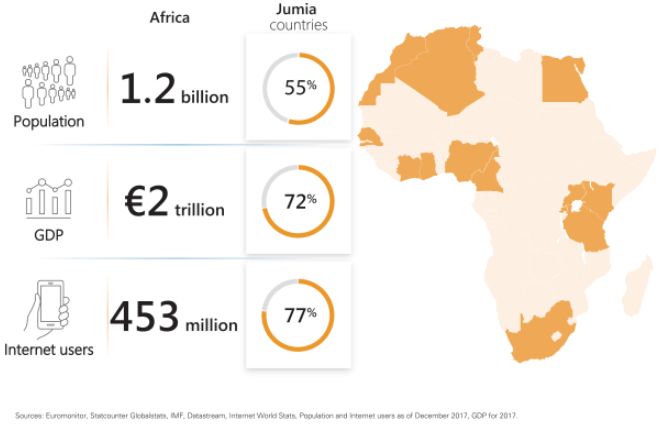 Jumia 覆盖的14国家GDP占非洲总体GDP的 72%,人工占非洲总人口的55%,移动互联网用户占非洲移动互联网总数的77%。