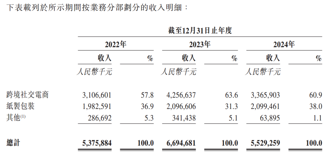 吉宏股份主要营收来源于跨境社交电商业务、纸制包装业务和其他。招股书显示,2024年吉宏股份的总营收为55.29亿人民币,净利润为1.84亿元人民币。其中,跨境社交电商业务收入为33.66亿人民币,在总营收中占比达60.9%。纸质包装业务收入为20.99亿人民币,在总营收中占比为38.0%。同时,跨境社交电商业务的毛利率较高,持续拉动公司整体毛利率提升,从2022年的40.5%提升至2024年的43.8%。