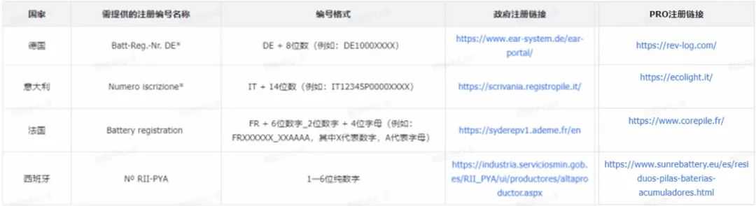 若表中未指定格式,请咨询相关政府机构或专业顾问。卖家需确保在相关政府平台或生产者责任组织(PRO)完成电池生产者延伸责任(EPR)注册且注册处于有效状态。
