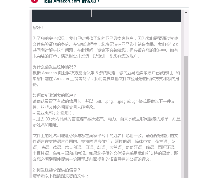 除二审之外,一些店铺也收到要求重新提供验证信息的邮件,例如营业执照、法人信息等等来重新激活店铺,这种难度并不大,但对于买号的卖家来说也是“一道难题”。