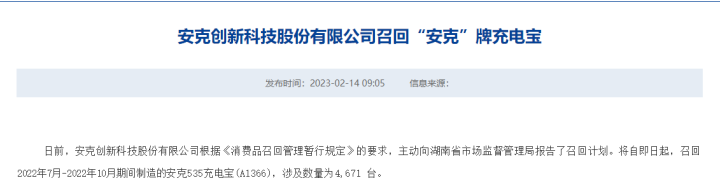 公告显示,安克创新根据《消费品召回管理暂行规定》的要求,主动向湖南省市场监督管理局报告了召回计划。安克创新将自2月14日起,召回2022年7月至2022年10月期间制造的安克535充电宝(A1366),涉及数量为4671台。