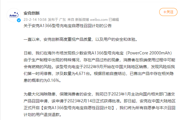 同日,安克创新也在官方微博发布公告,称该型号充电宝于2022年9月开始在中国大陆地区销售,发现风险后已停售。根据目前自查结论,已售出产品中存在相关隐患的概率约为0.16%。