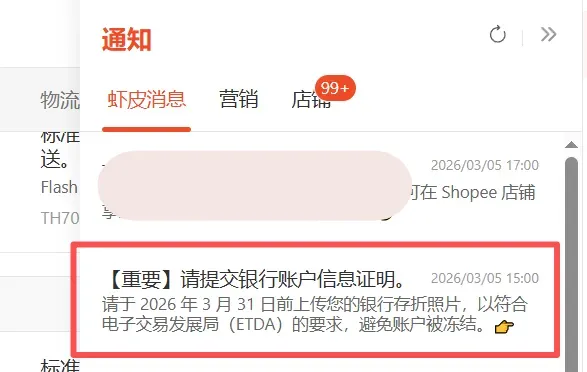 早在2026年3月5日,Shopee泰国站卖家就已收到平台官方通知,要求在3月31日前上传银行存折照片以完成银行账户信息核验。
