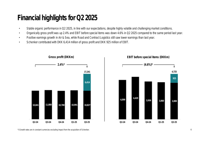 在2025年第二季度,DSV的总毛利润达到172.41亿丹麦克朗,较2024年Q2的108.41亿丹麦克朗增长显著。息税前利润(不含特殊项目)为47.25亿丹麦克朗,高于去年同期的40.99亿丹麦克朗。其中,同比增长的利润部分得益于DB Schenker的收购,为DSV增加了64.14亿丹麦克朗毛利润和9.25亿丹麦克朗EBIT。