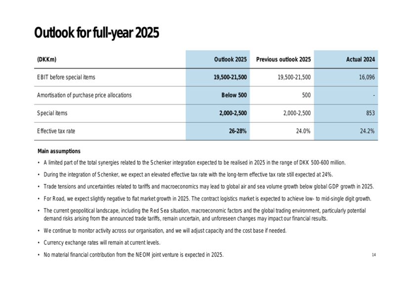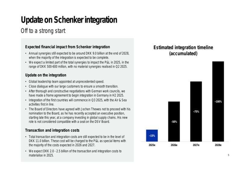DSV计划在未来三年内完成整合工作,预计到2025年底完成约15%,到2026年完成50%,到2027年完成75%,到2028年底实现全面整合,届时将实现90亿丹麦克朗的年度协同效益。