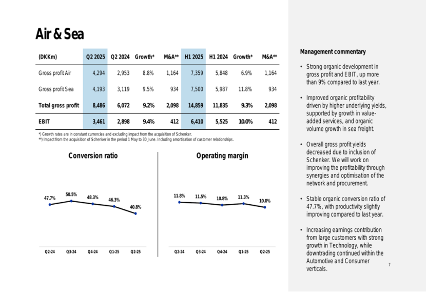 受益于DB Schenker的并表以及客户前置出货行为,DSV在2025年第二季度航空货运量显著增长,达到50.8万吨(包括DB Schenker),同比增长46%,上半年同比增长23%。航空货运业务营收为186亿丹麦克朗,同比增长38.7%;毛利润达43亿丹麦克朗,增长8.8%。海运总运量增长43%,毛利润增长10%。