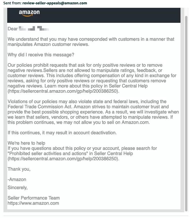 就在今天,有公司反映说,收收收收到了亚马逊绩效团队的警告信,请看下文:
