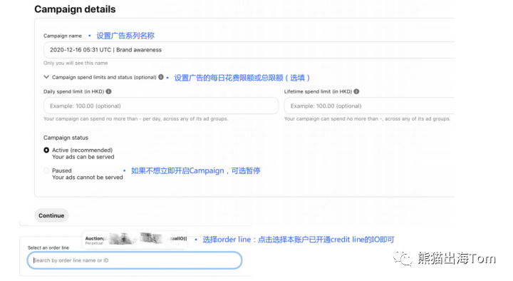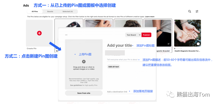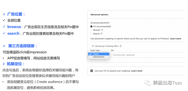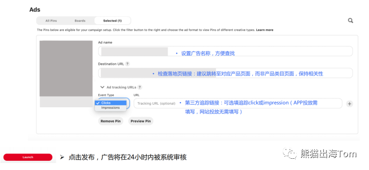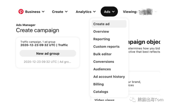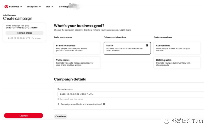根据业务需要,选择特定广告目标,若选择Conversions,需要提前安装好 Pinterest Tag.
