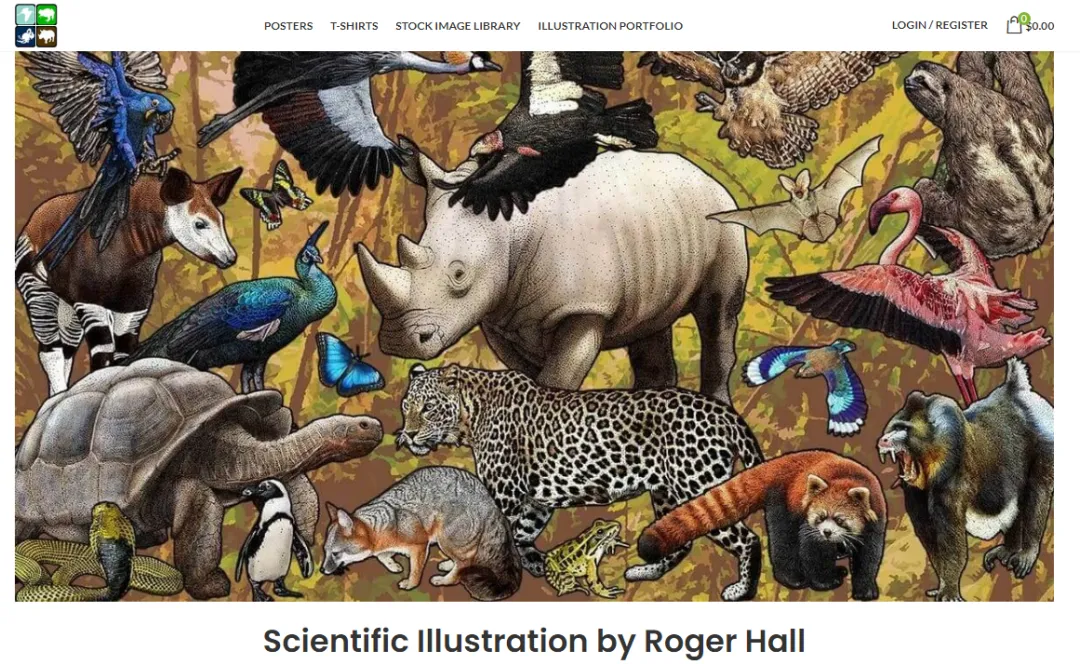 Roger Hall 是一位美国奥克兰(Oakland)地区的野生动物插画师与科学绘图艺术家,从 1990 年起专注野生动物及建筑图绘,作品遍及野生动物主题海报、图鉴、印刷品等。