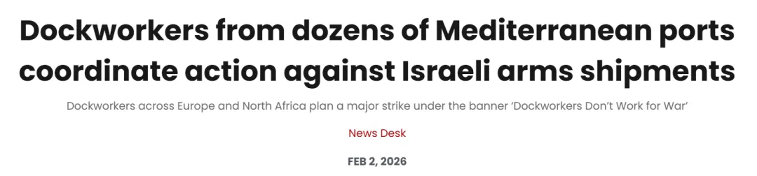 总部位于意大利热那亚的基层码头工人工会——Unione Sindacale di Base(简称USB)正式宣布,将于2026年2月6日发起国际总罢工,核心诉求为抗议以色列武器运输活动。