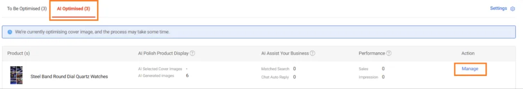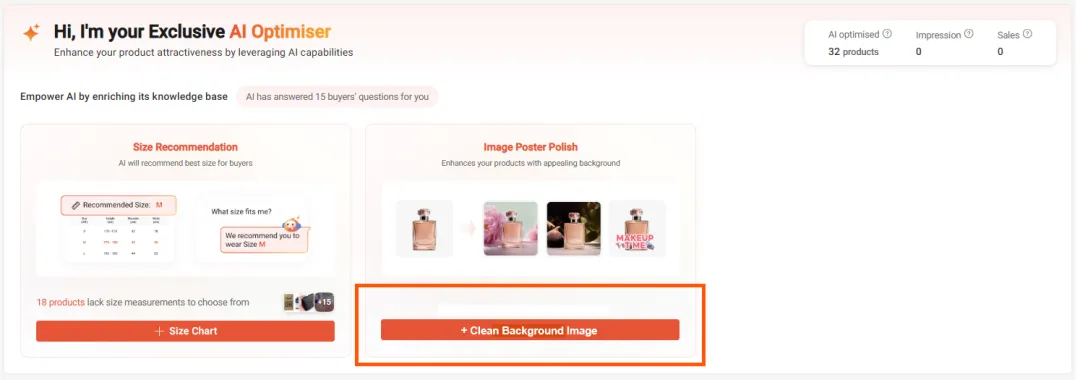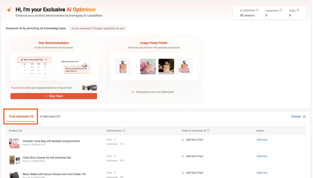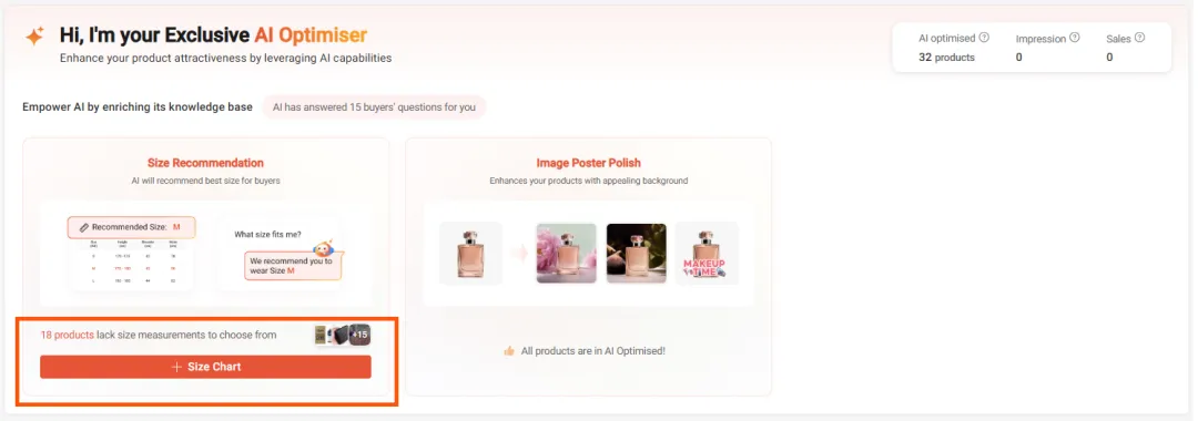 作为回报,产品AI优化器将帮助您向买家推荐尺寸,并生成高质量的AI产品图像。您还将全面了解通过AI优化的列表所带来的流量和销售情况,以及AI如何帮助每个产品的清晰概述(例如,自动回复的聊天数量等)。这些见解可以在AI优化标签下查看。