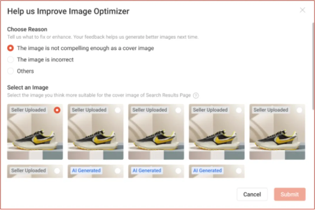 图像优化器是AI优化器设置中的一项功能,它会自动选择每个列表中表现最佳的照片。通过开启此功能,系统会识别出您的产品图片中哪个获得了最多的点击,并将其设置为在搜索结果页面、每日发现页面和您可能还喜欢页面显示的主要封面图像。
