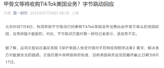 据第一财经报道,北京时间7月8日,有消息称字节跳动已同意将TikTok美国业务出售给由甲骨文牵头的美国财团,自身保留少数股权。对此,字节跳动方面对第一财经记者表示,该信息不实。