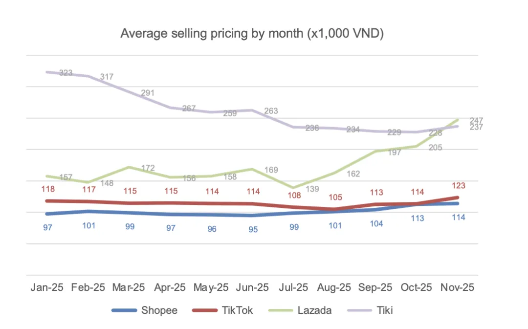 在定价策略方面,Shopee 和 TikTok Shop 都将自身定位为平价购物平台,其平均售价 (ASP) 远低于竞争对手。具体而言,Shopee 的平均售价在 97,000 越南盾至 114,000 越南盾之间,而 TikTok Shop 的平均售价则在 118,000 越南盾至 123,000 越南盾之间。Shopee 的价格范围更广,涵盖了平价和高端商品,而 TikTok Shop则主要专注于低价商品,以刺激冲动消费。