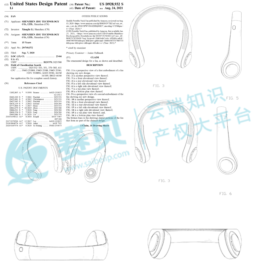 本次案件涉及两项美国外观专利,分别为外观设计专利 US D928,932S(2020 年 9 月 7 日申请,2021 年 8 月 24 日授权)和发明专利 US 11,920,602 B2(2023 年 4 月 14 日申请,2024 年 3 月 5 日授权),是一款可佩戴在颈部的风扇,适用于户外活动、办公等场景,解放双手并实现多角度冷却。赛贝提醒跨境卖家,未经授权不得擅自使用,以免引发侵权风险。