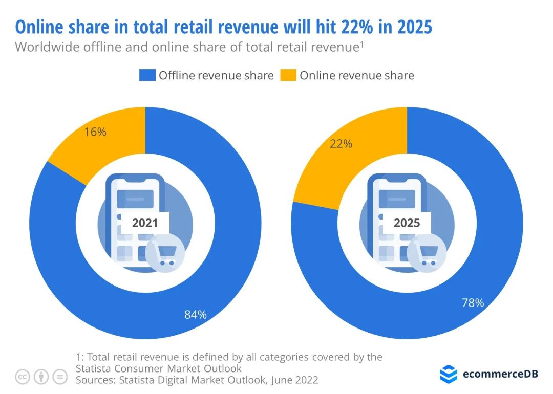 根据Statista数字市场展望,2021 年全球电子商务市场价值超过3.8万亿美元,到2022年底总收入将达到4.2万亿美元。所有这些趋势不仅导致电子商务销售额的绝对增长。目前Statista分析显示电子商务在整个零售业务中的相关性越来越高: