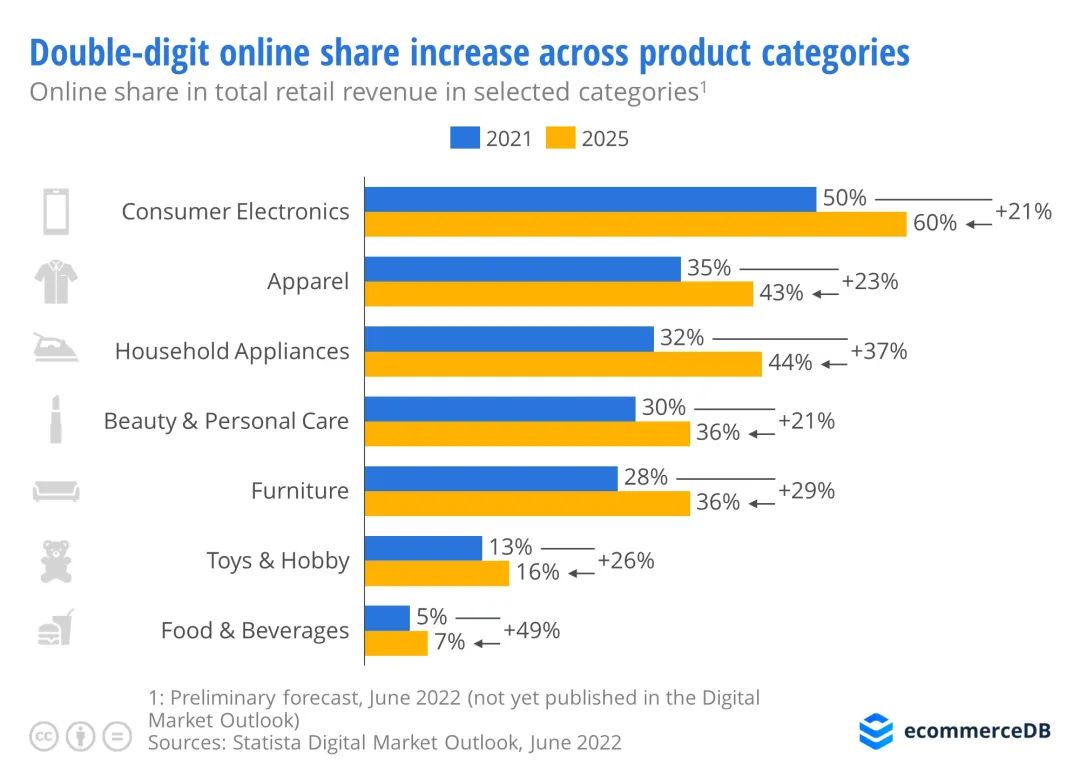 预计到 2025 年,在增长 21% 之后,3C电子产品的在线收入份额将达到60%。 | |