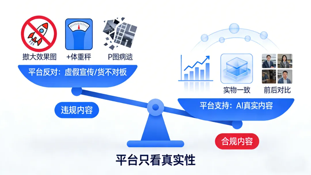 但我们在实测中发现,平台其实并没有限制AI素材,平台限制的永远是“低质量、夸大和虚假宣传”。 以前的老一代数字人之所以跑不通,不是因为它是AI,而是因为它“太假、太丑、动作僵硬”,触发了平台的低质内容拦截网。