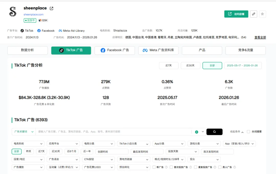 根据pipiads数据分析: 单店累计投放 6,393 条广告,总播放量 77.9M(近 8000 万)