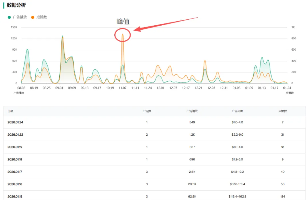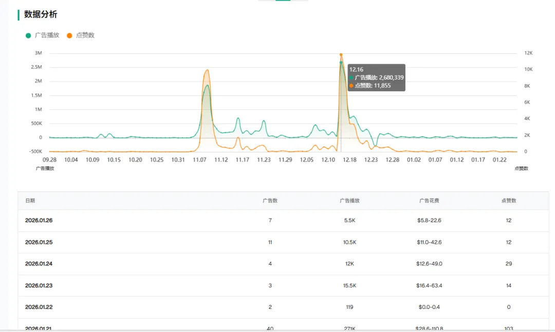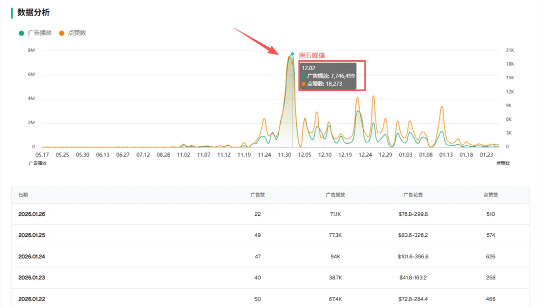注意看这段数据波峰,在黑五期间,曲线几乎是垂直拉升。 这是传统人工团队绝对做不到的。唯一的解释是:他们在关键节点把 AI 算力拉满,瞬间向市场倾泻了数百条素材。