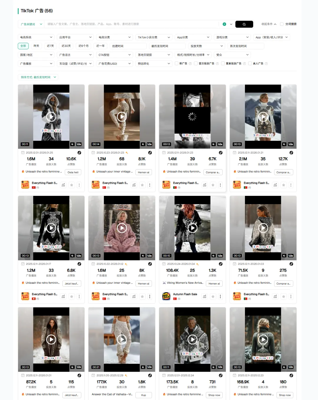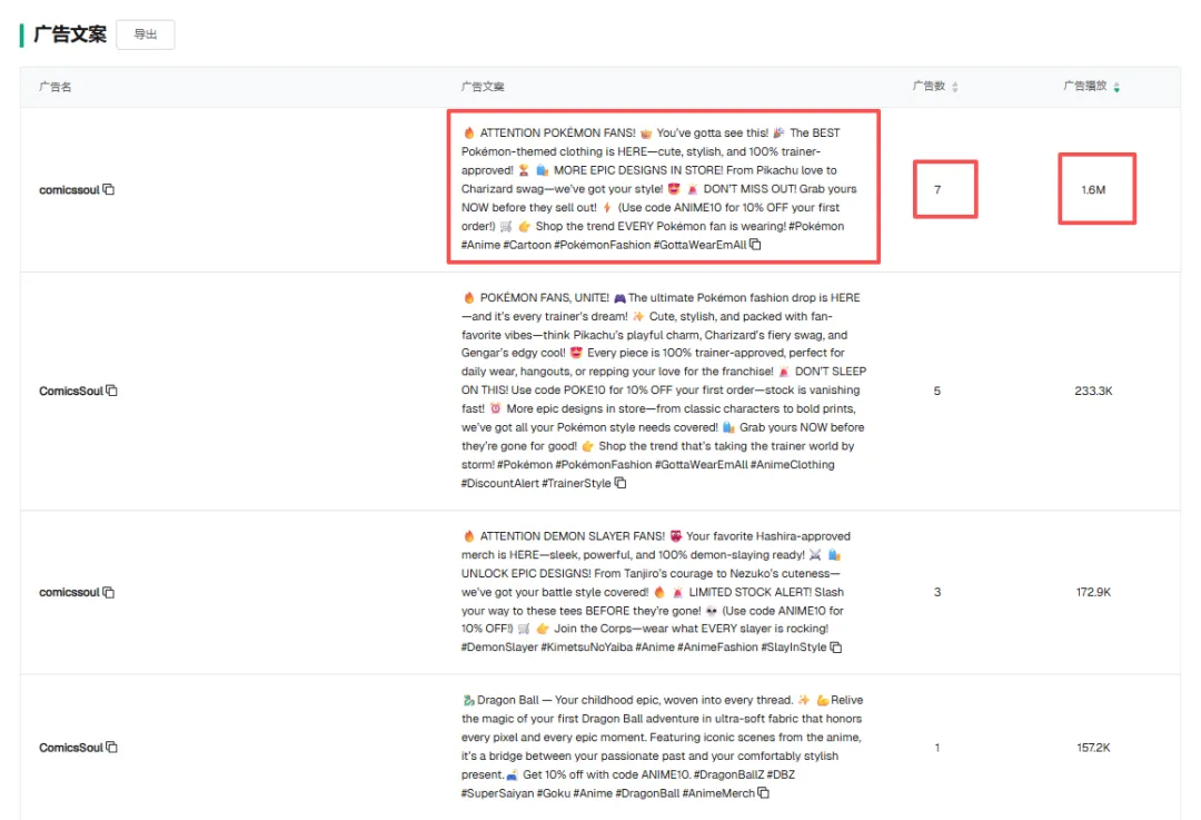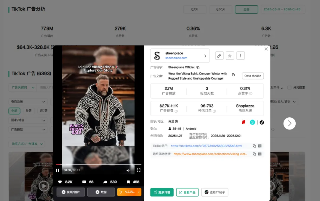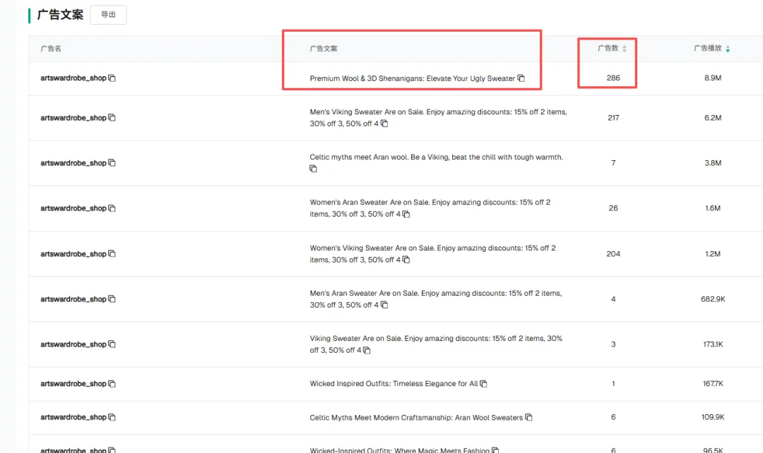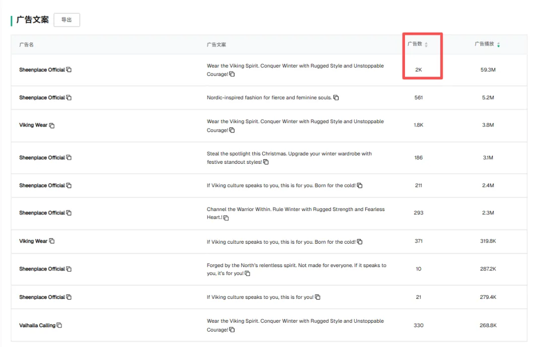 看第一的这条文案 Wear the Viking Spirit... 它关联了 2,000 (2K) 条广告素材,跑出了 59.3M 的播放量。
