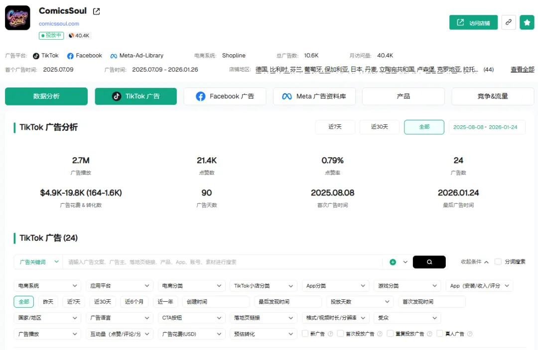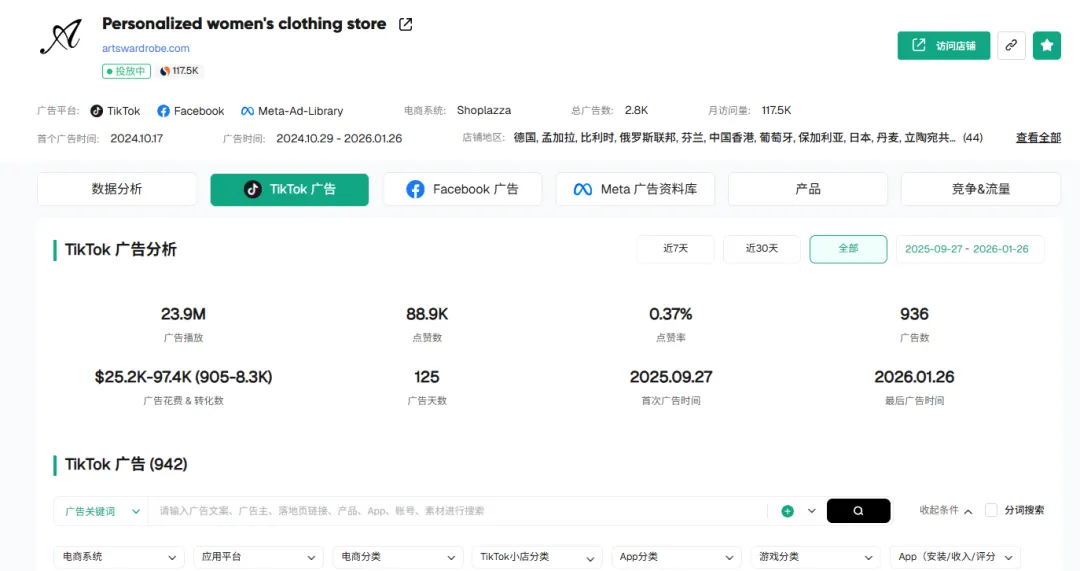 这是一家主攻男性服饰的独立站 ,根据Pipiads的后台数据,仅仅在 TikTok 的一个渠道,这家店就运行了23.9M(近 2400 万)的广告播放量。累计投放广告数达到936条。