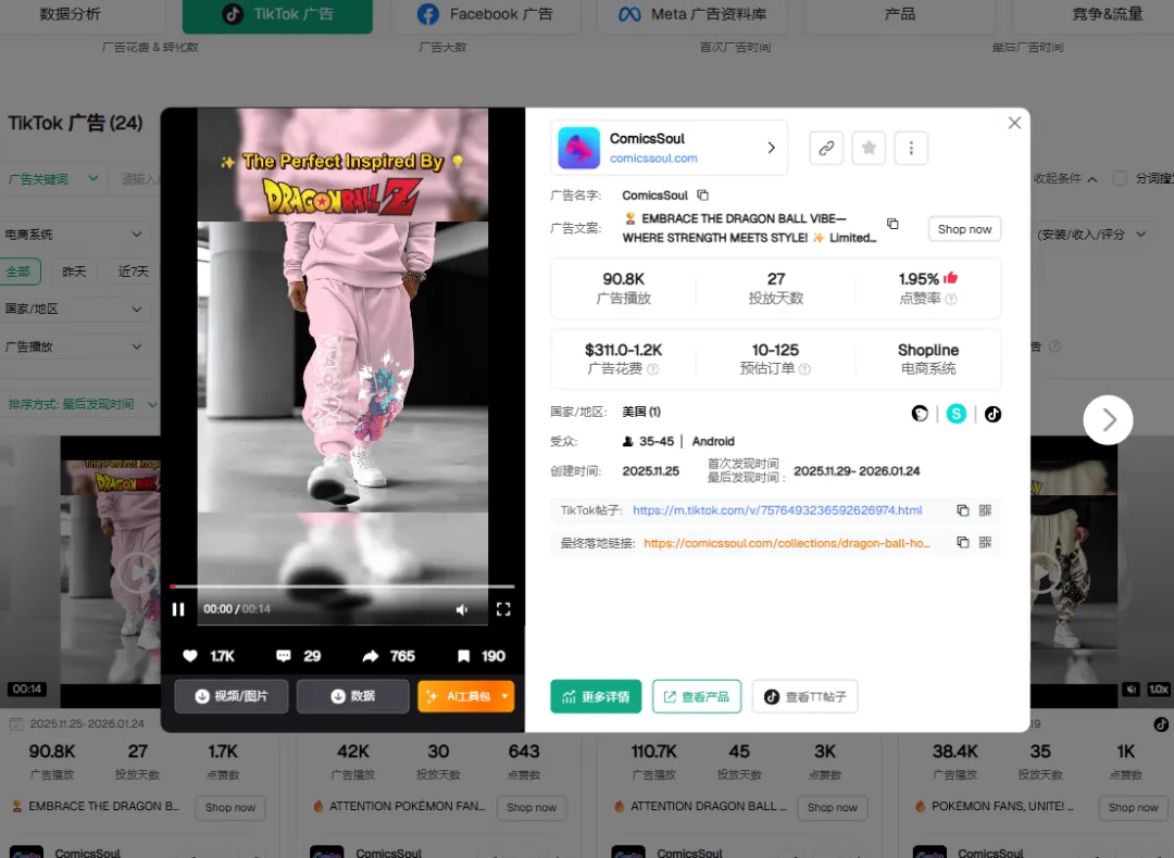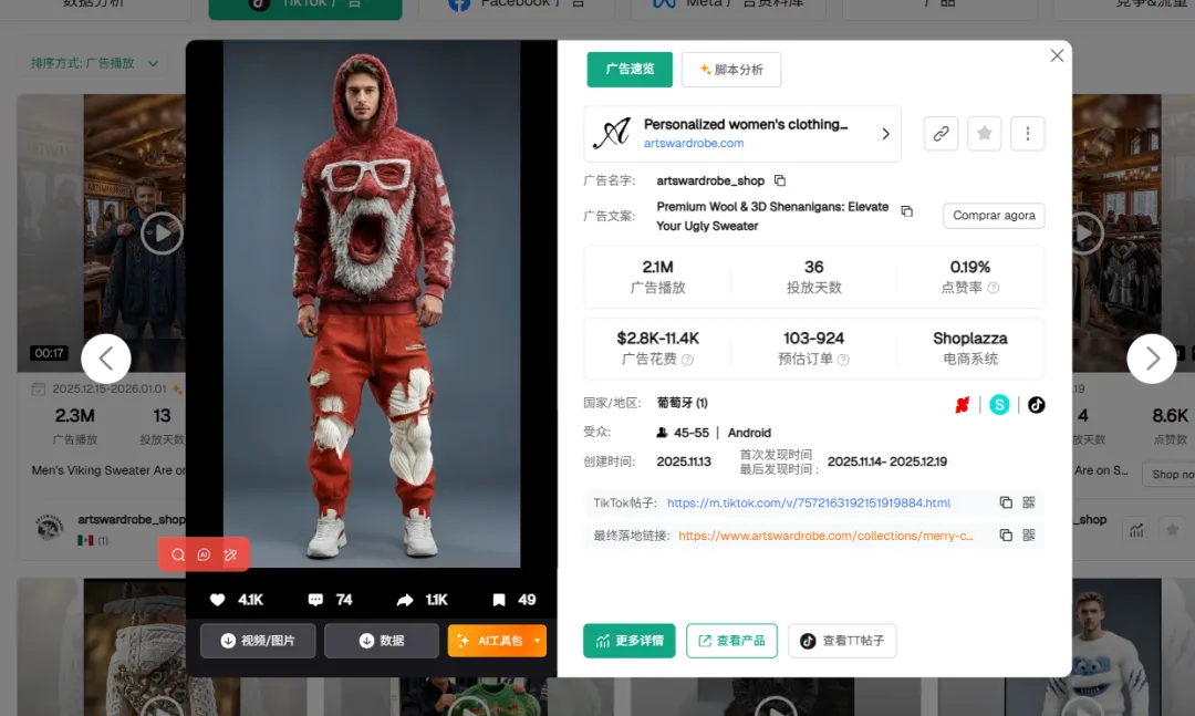 这家店累计投放了 10.6K 条广告,近期播放量达到 2.7M。 “内容工业化”做到了极致。如果靠人工拍摄每一款联名卫衣,光是样衣制作和模特排期就能拖垮你。但通过 AI,他们实现了零成本的“虚拟上身”。