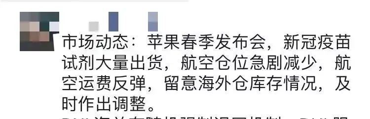 ②苹果在上海,昆山,郑州,深圳,成都等地大量出货,导致航司仓位紧缺,造成供需不平衡。