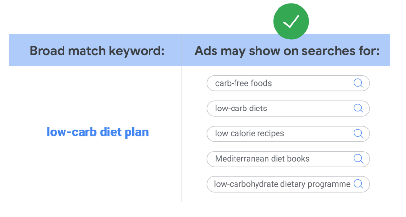 举个例子,如果在广告关键词“low carb diet plan”使用广泛匹配,那用户输入“carb-free foods”“low-carb diet”“low calorie recipes”,都可能展示你的广告。