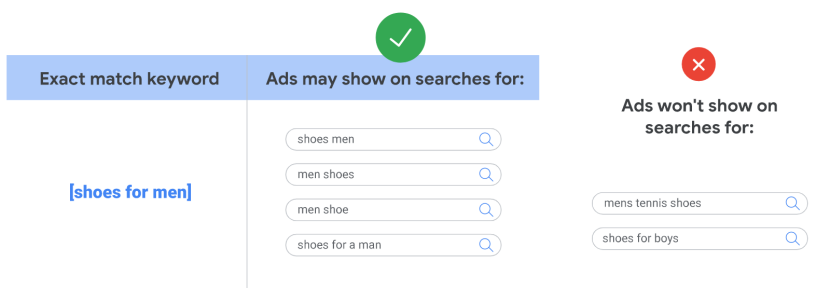 完全匹配是需要用户搜索内容与关键字的含义或意图相同,才能进行广告展示。当关键词“shoes for man”使用词组匹配时,用户输入“shoes man”“men shoes”的时候,你的广告才有可能会展示。