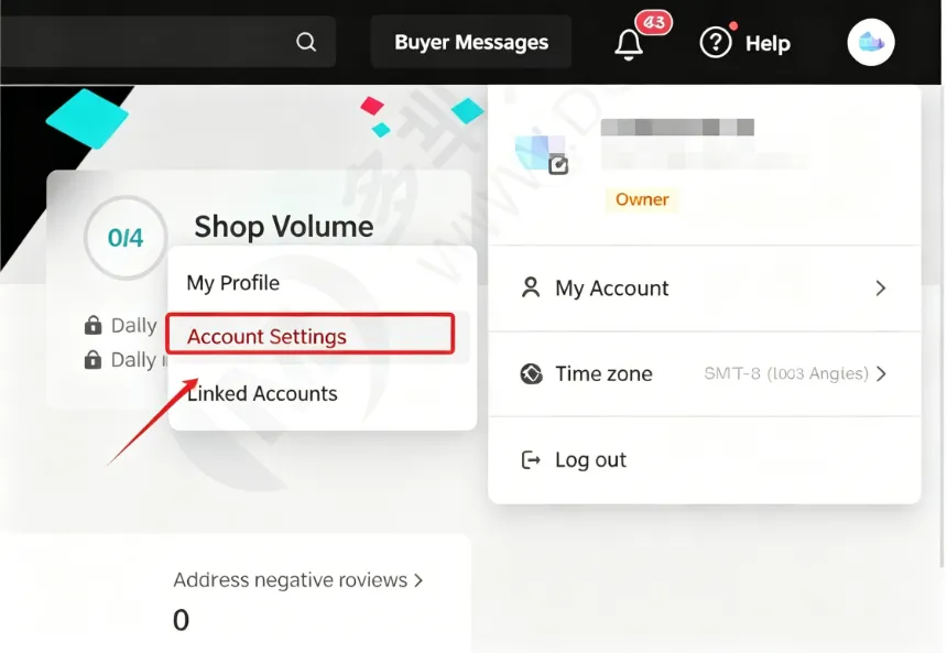 登录TikTok Seller Center,进入TikTok卖家中心,点击右上角头像,点击“MyAccount”,再选择“AccountSettings"