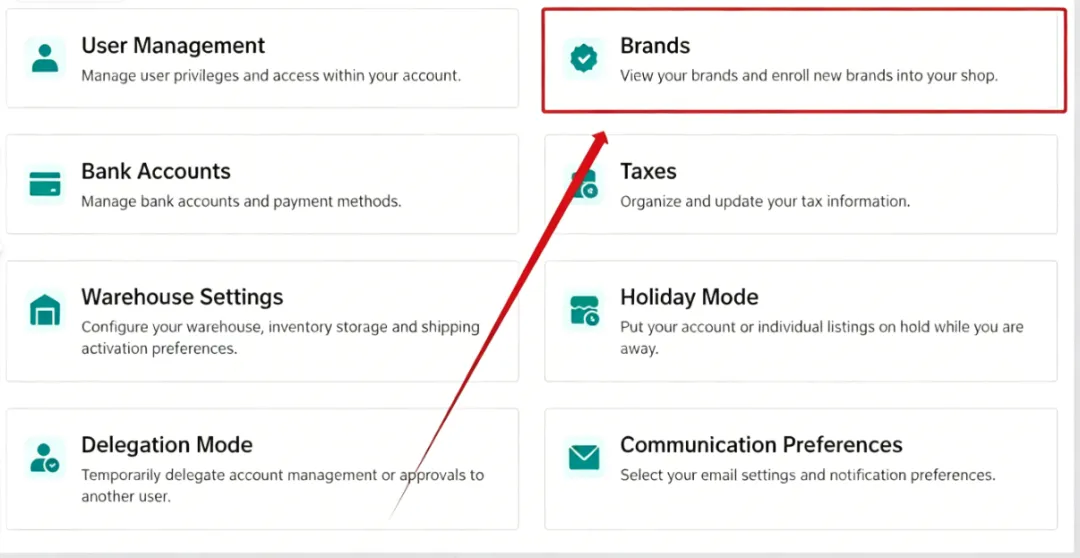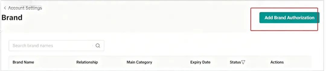 进入账户设置页面,“Brands”→“Add Brand Authorization”