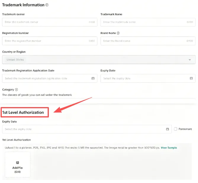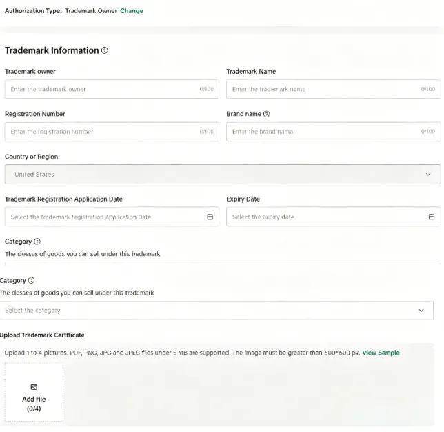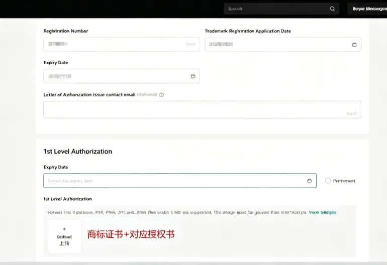 填写商标信息:商标持有者名称、商标名、注册号、申请日期、到期日期、上传商标的证书电子版,提交审核。